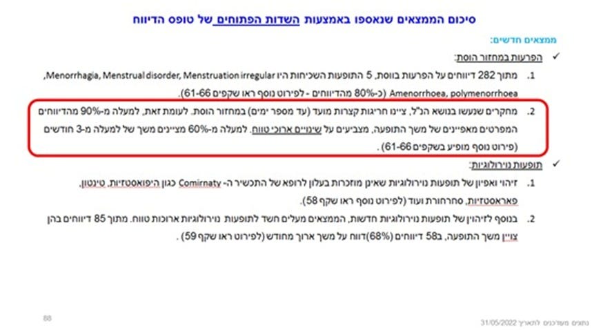 מה קרה למשל, לשקופית שבה הם כתבו על ההפרעות במחזור החודשי, שבניגוד למה שדווח עד כה, מצאתם שלמעלה מ-90% מהדיווחים המפרטים המאפיינים של משך אירוע לוואי זה מצביעים על שינויים ארוכי טווח"?