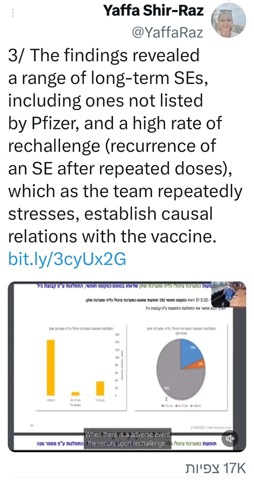 "הכל מצוי בתוך הדו"ח. ז"א, כל הנתונים ללא יוצא מן הכלל מצויים בתוך הדוח שפורסם ע"י משרד הבריאות. לא הסתרנו דבר. יש לנו רפיוטיישן בכל הנושא של תופעות לוואי. הדוח הסופי הוא הדוח שלנו חד משמעי!".