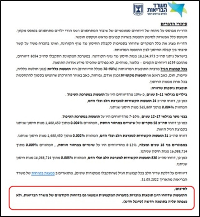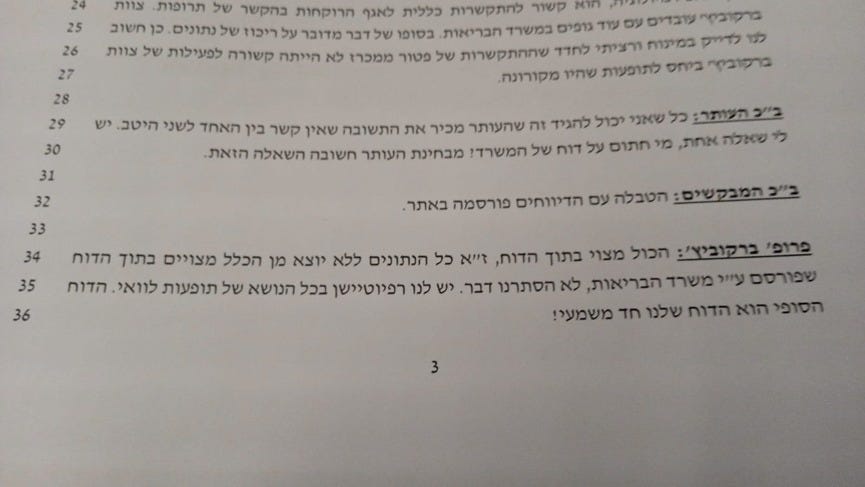 בדיון אתמול טען ברקוביץ שהוא סומך את ידיו על דוח תופעות הלוואי שפרסם משרד הבריאות – דוח שמסקנותיו הפוכות מאלו שהוא וצוות חוקריו הציגו בפני המשרד בדיון המודלף מיוני 2022. מה קרה למסקנות הדוח המקורי?